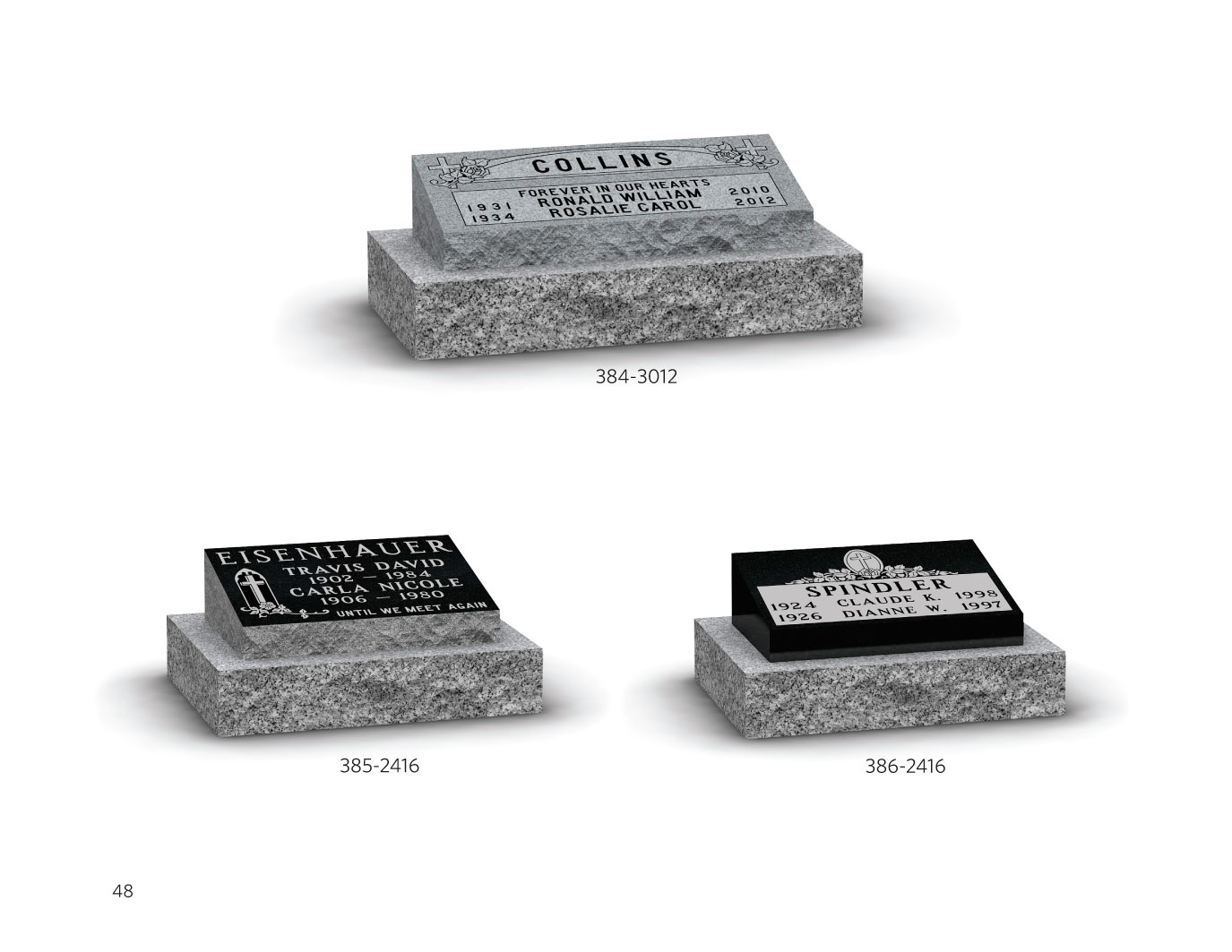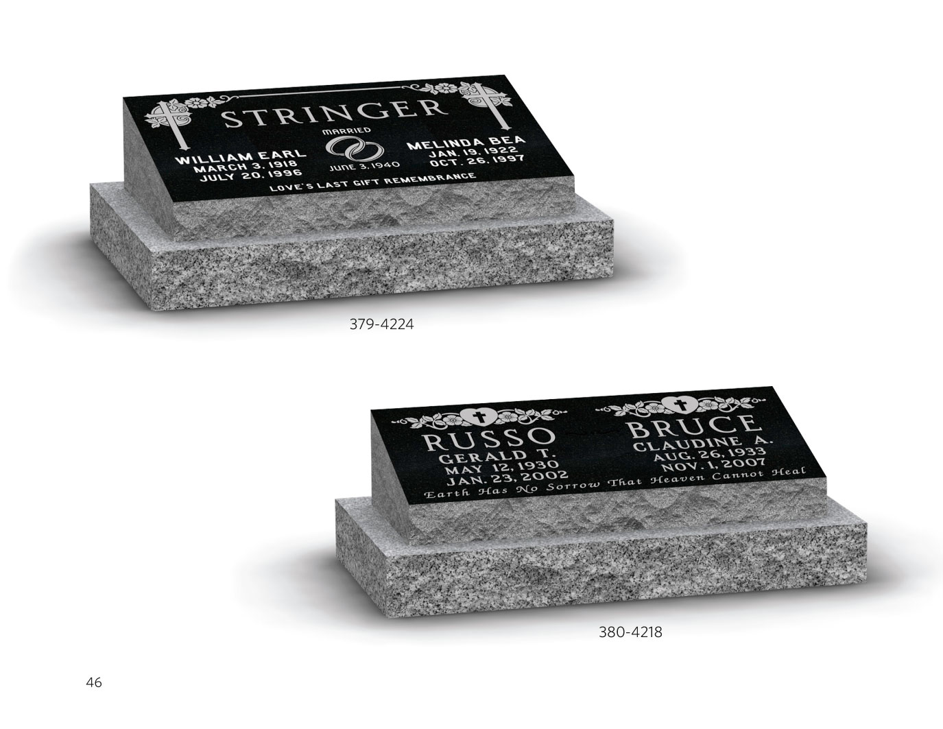 The monuments shown in this catalogue are a representation of the colors, sizes, shapes and designs of what is available. Most designs are interchangeable between monument sizes and shapes. Please contact us to answer any questions you may have. We will be pleased to assist you. 1-800-661-4621